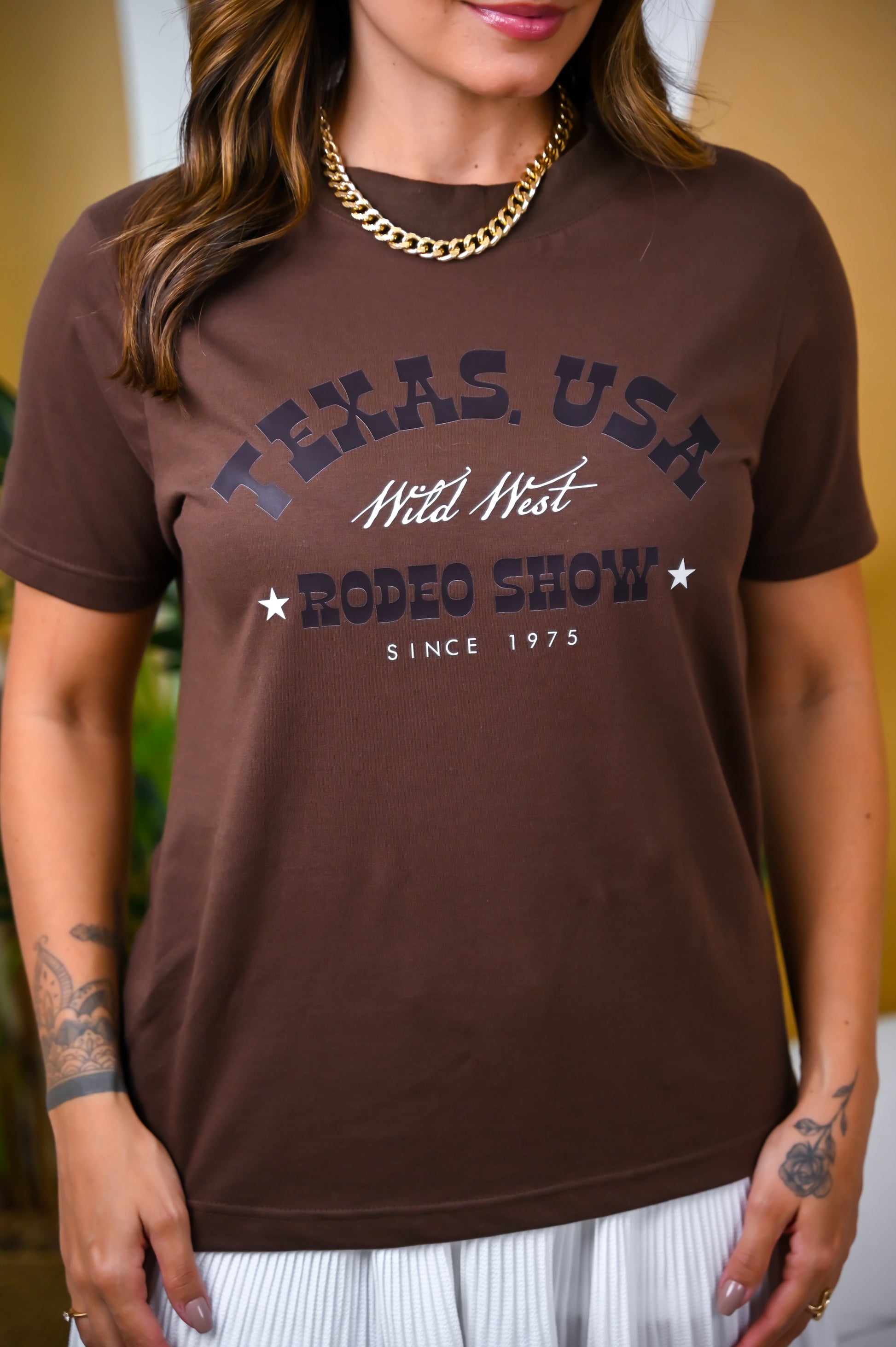 Blusa de meia malha 100% algodão na cor marrom brown com estampa country TEXAS, USA, com golinha mais alta.