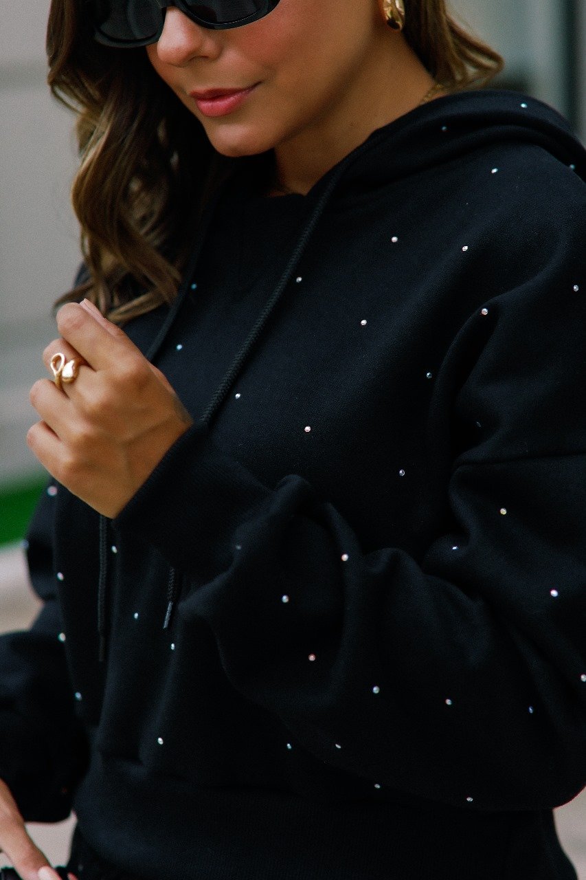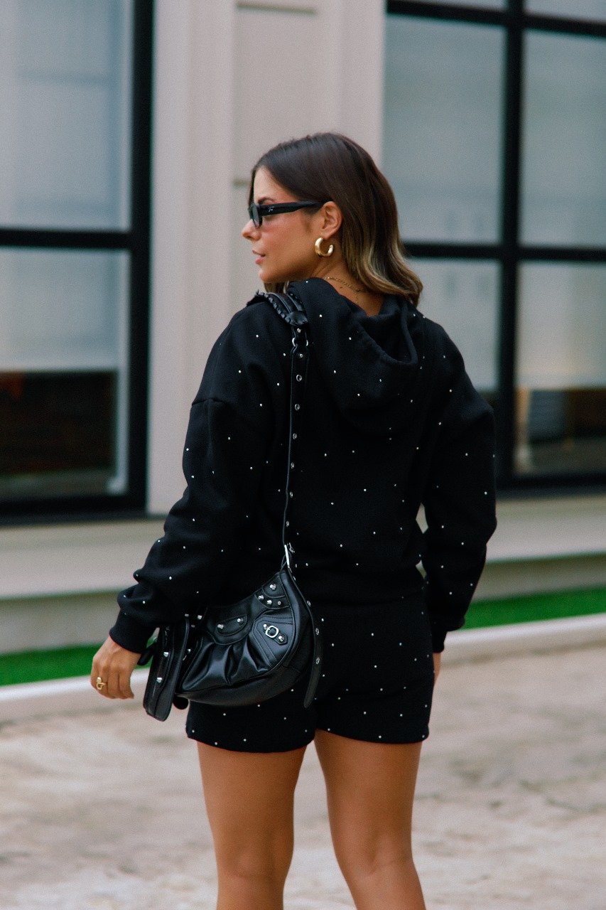 Conjunto de moletom estiloso e confortável, composto por um shorts e um casaco com capuz. Confeccionado em moletom grosso de 2 cabos (50% algodão, 50% poliéster), com detalhes em strass para um toque glamuroso. O shorts possui elástico na cintura, enquanto o casaco tem elástico nos punhos e barra, além de cadarço ajustável no capuz. Perfeito para looks casuais cheios de personalidade.