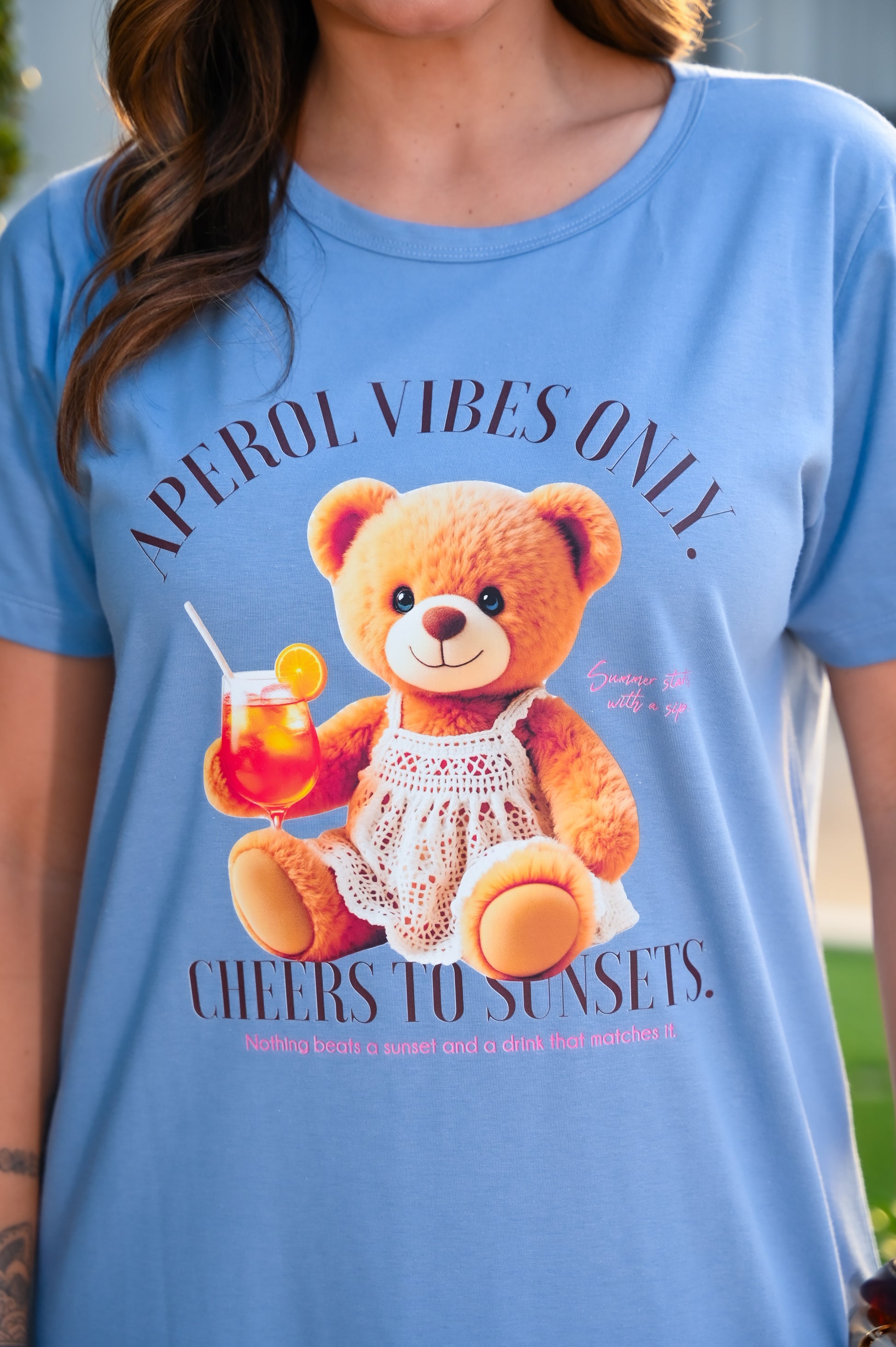 Vestido de meia malha algodão com estampa Aperol Urso e com fenda lateral na cor trend do verão azul.