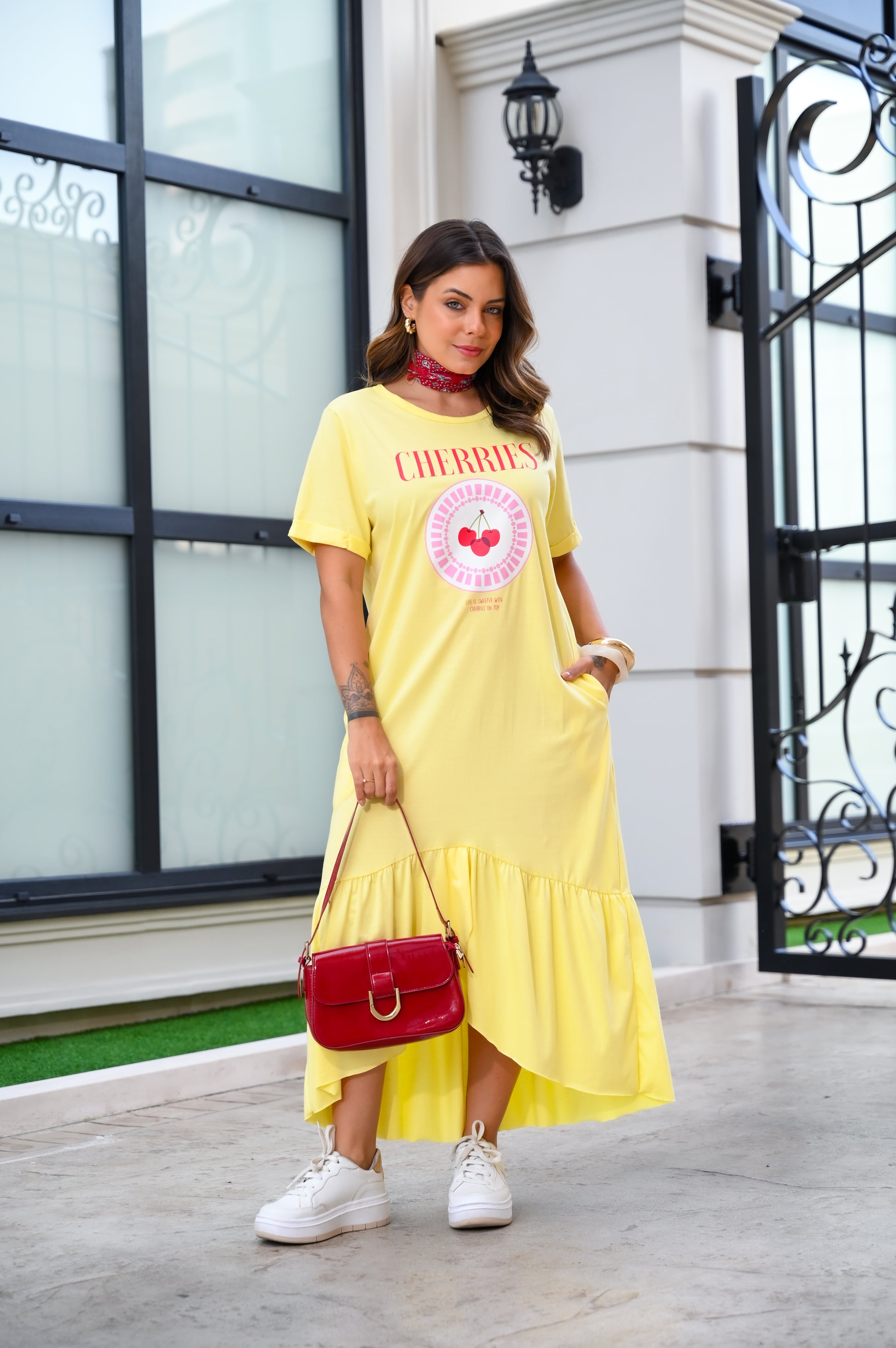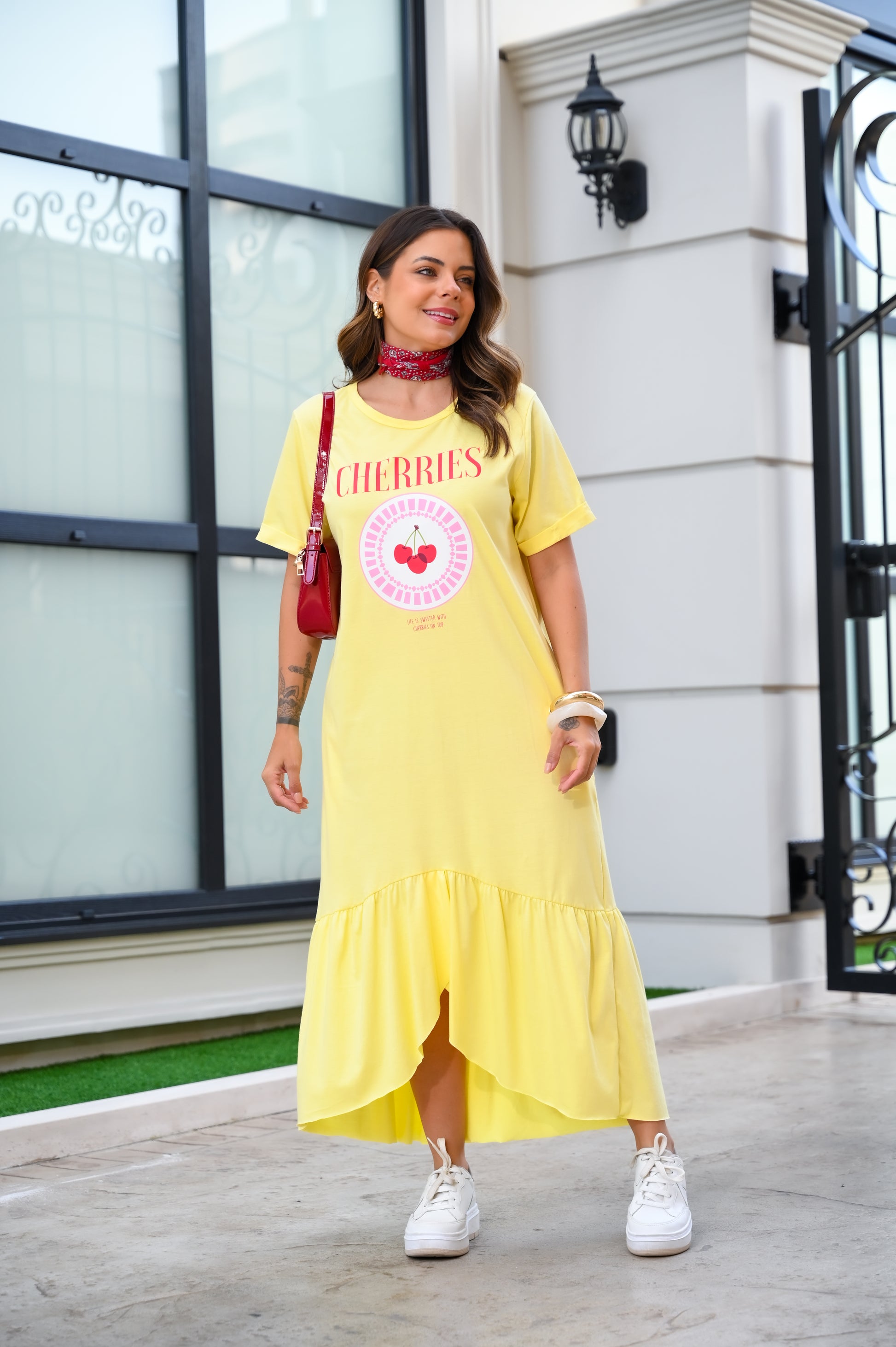 Vestido de meia malha 100% algodão em cor amarelo manteiga trend do momento e estampa personalizada cherry.