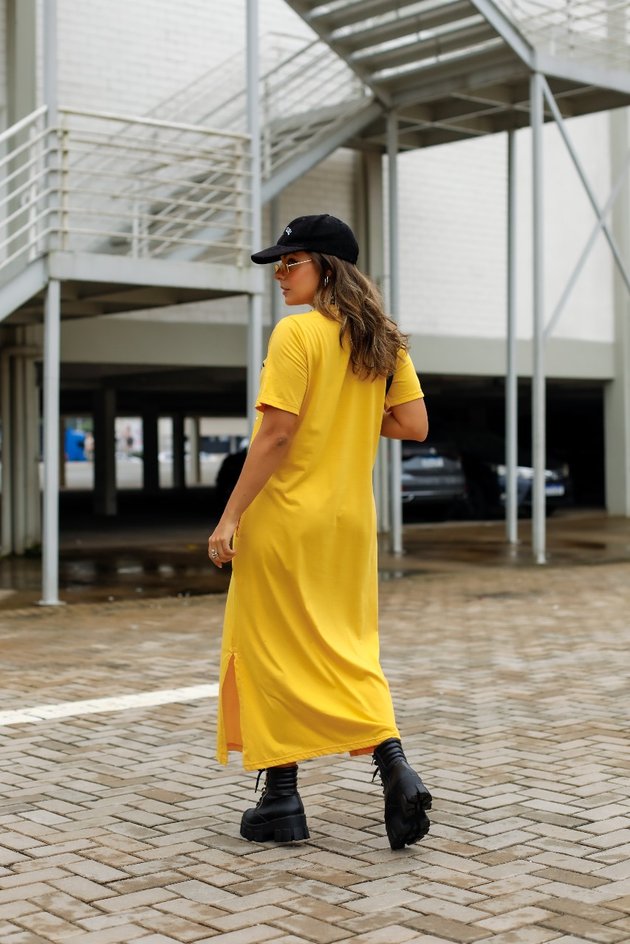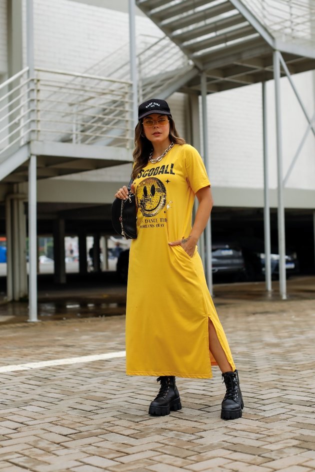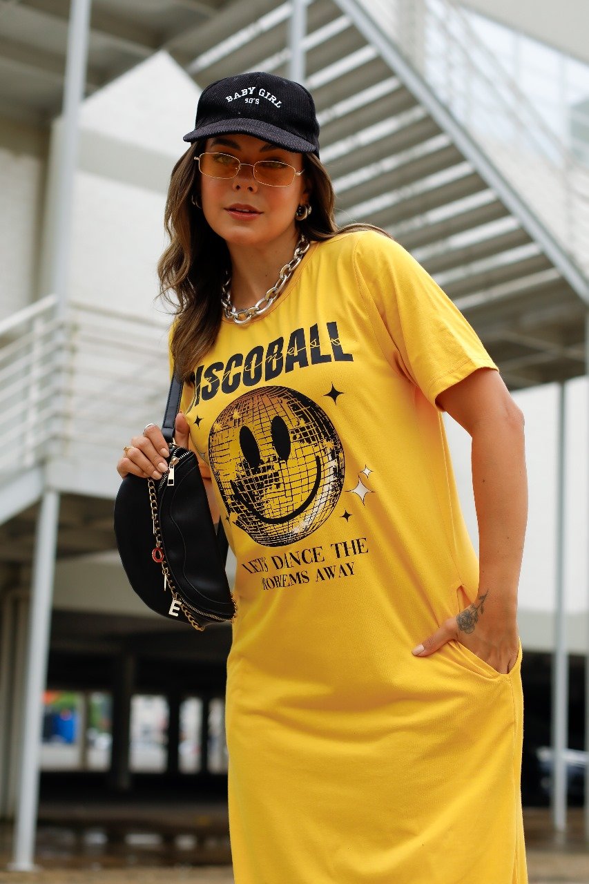 Renove seu guarda-roupa com o vestido midi 100% algodão, uma peça cheia de estilo e conforto. Ele apresenta rachas laterais, bolsos, gola redonda e mangas curtas, oferecendo praticidade e versatilidade. O destaque fica por conta da estampa moderna de globo e as frases inspiradoras “DiscoBall” e “Let’s Dance the Problems Away”, ideais para quem busca uma vibe descontraída e cheia de brilho. Combine com botas ou tênis para criar looks incríveis para diversas ocasiões!