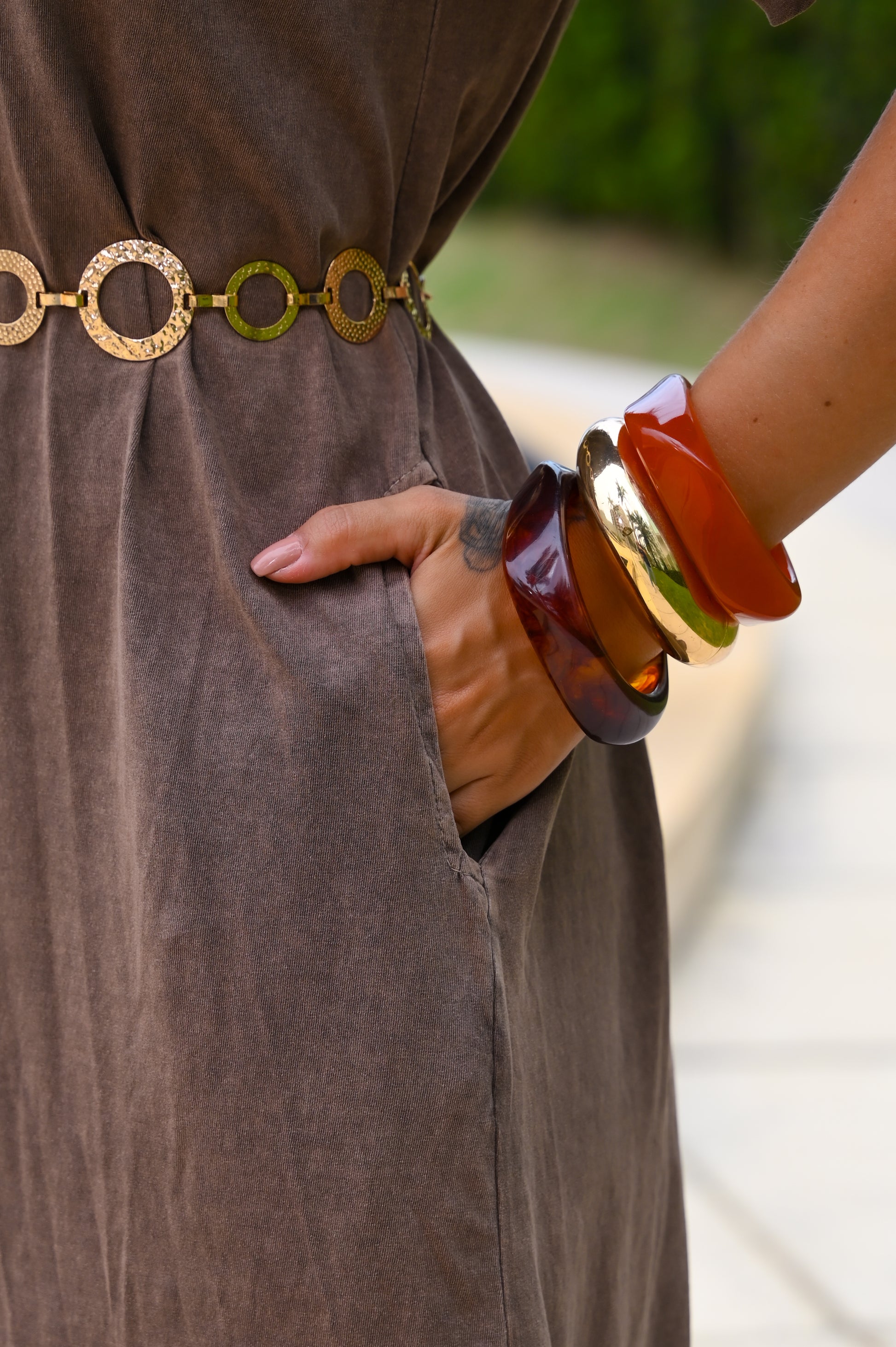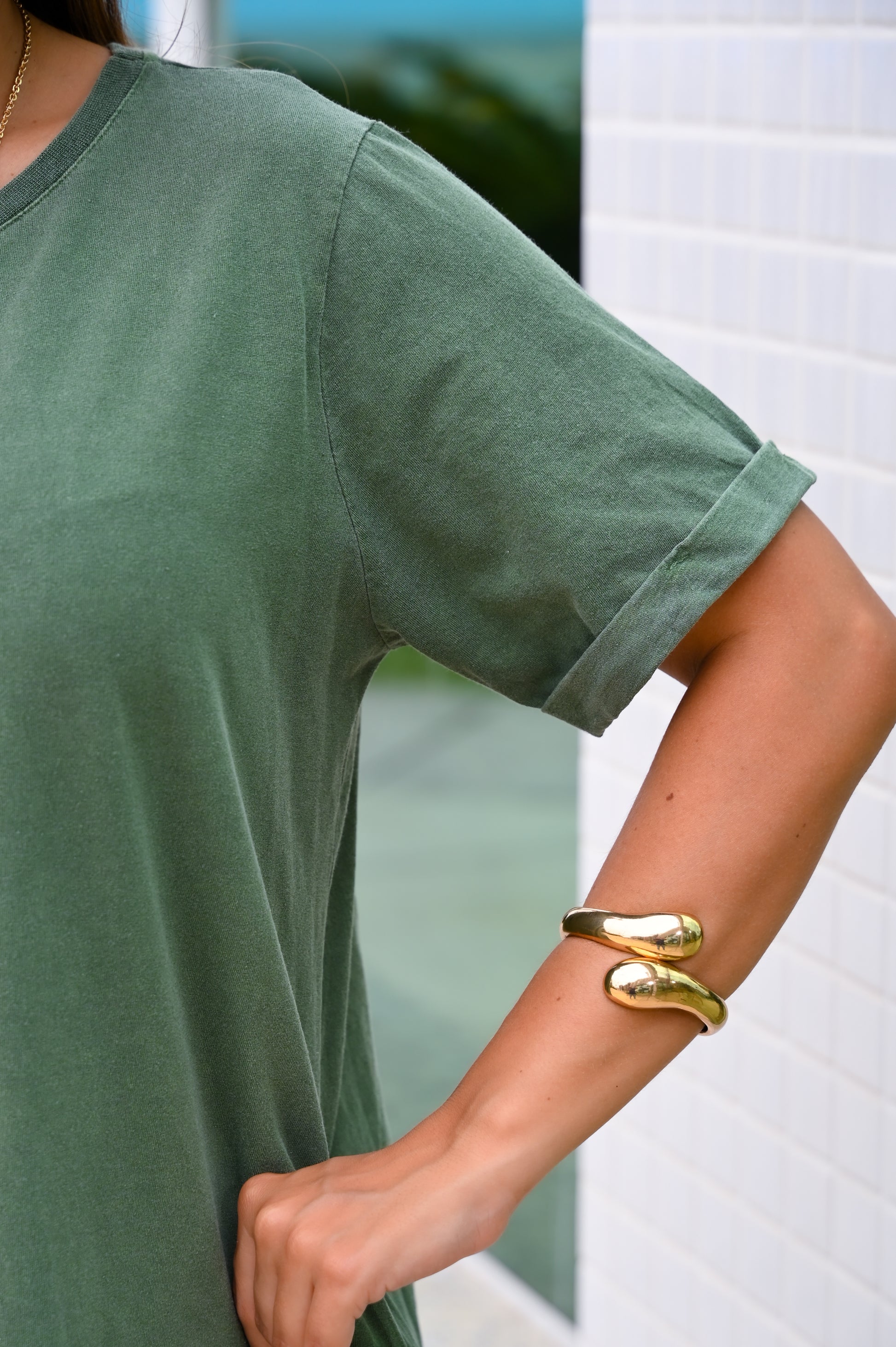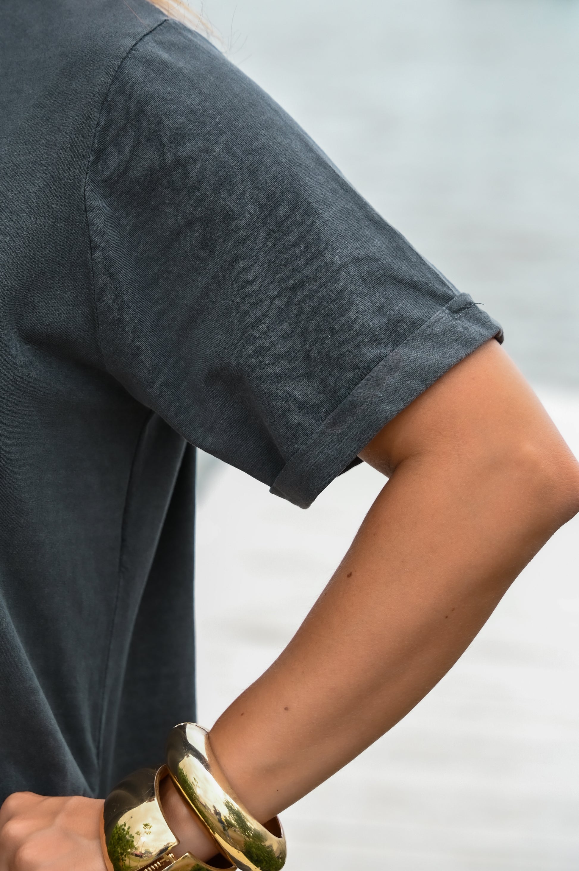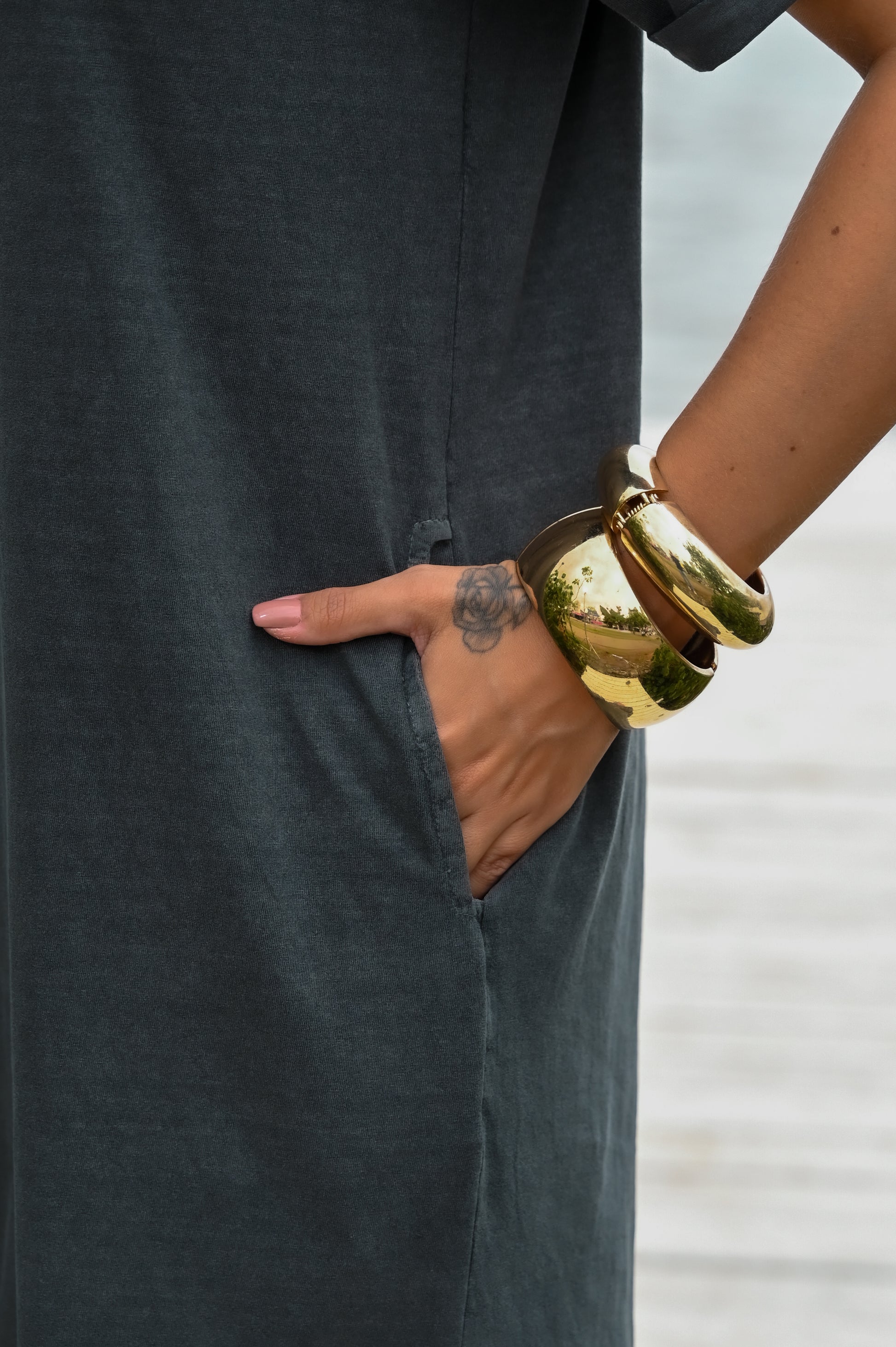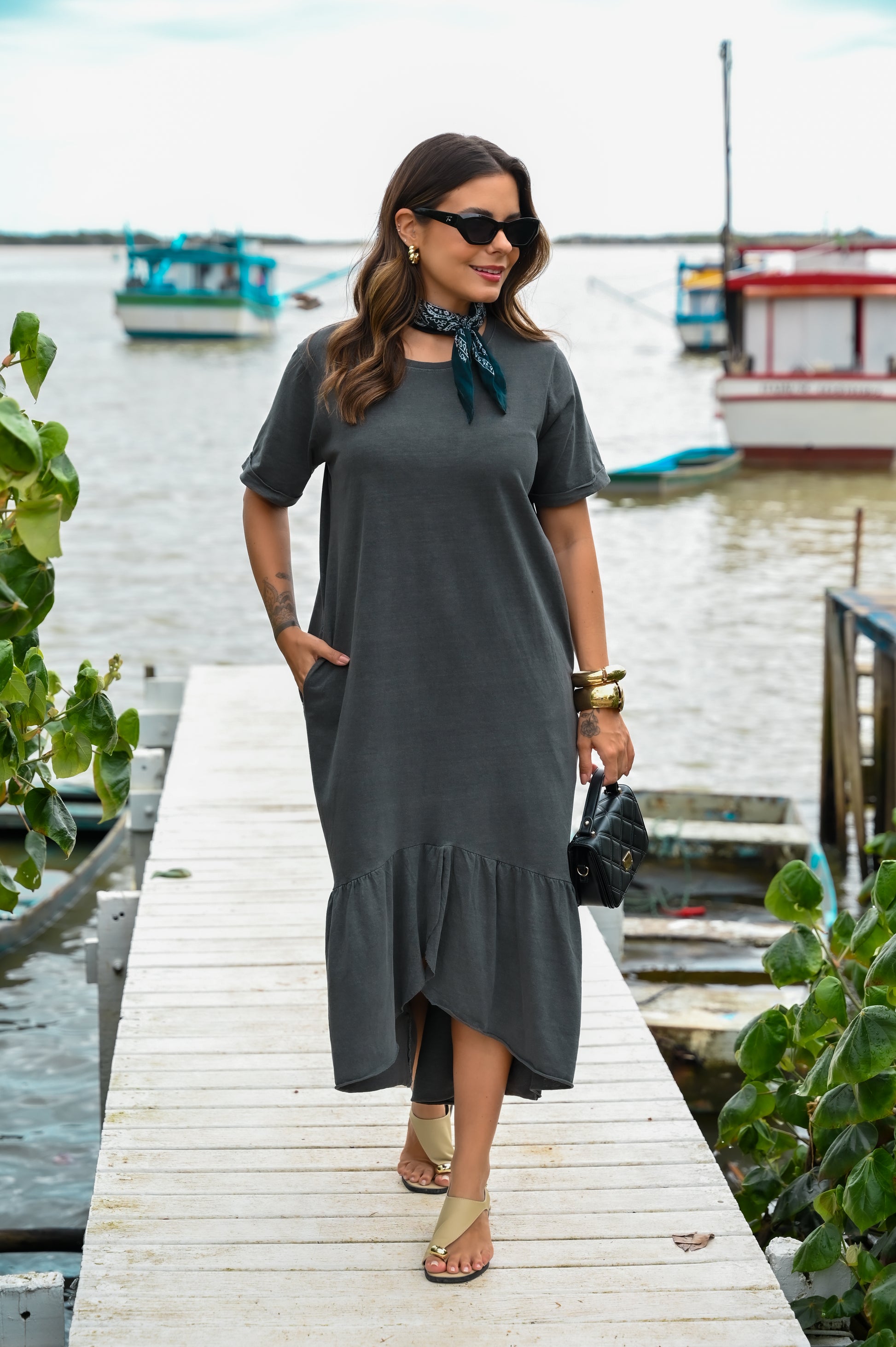 Com mangas curtas dobradas, bolsos práticos e uma modelagem ampla, este vestido combina funcionalidade e estilo. A gola redonda completa o look descontraído, perfeito para dias mais quentes e ocasiões casuais.